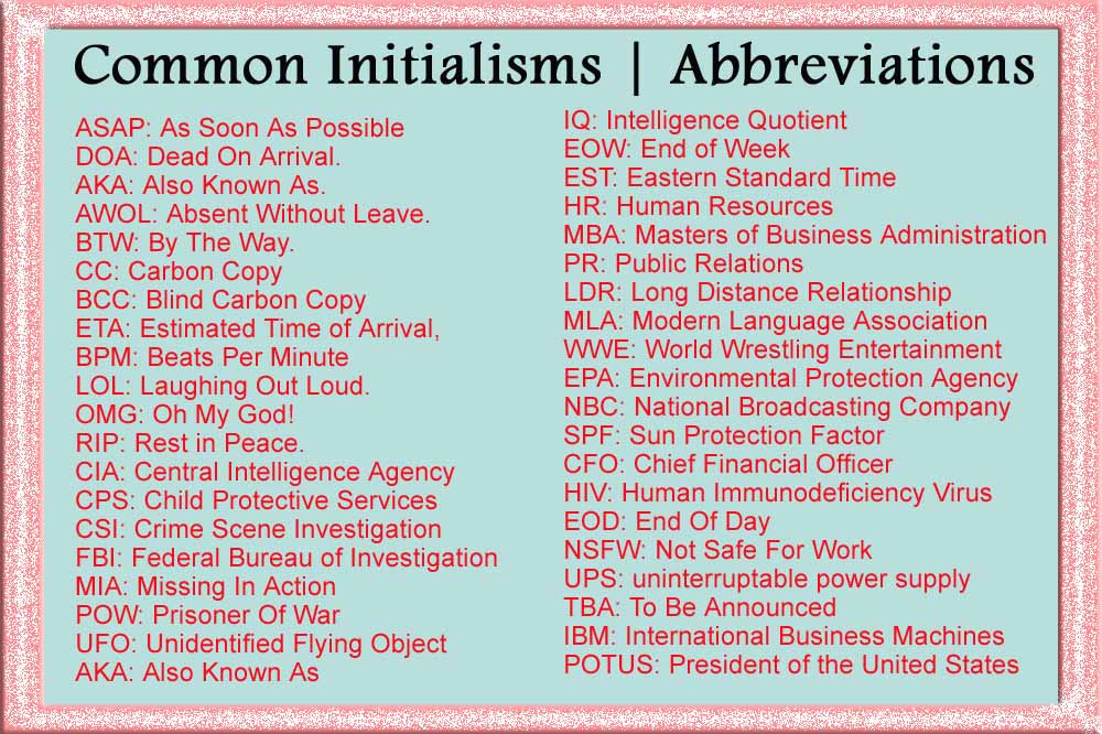 To make an abbreviation is the way to shorten a word, a phrase or an idea. In this article, we will learn about some common abbreviations. These abbreviations include 50 common initialisms and 20 common acronyms.